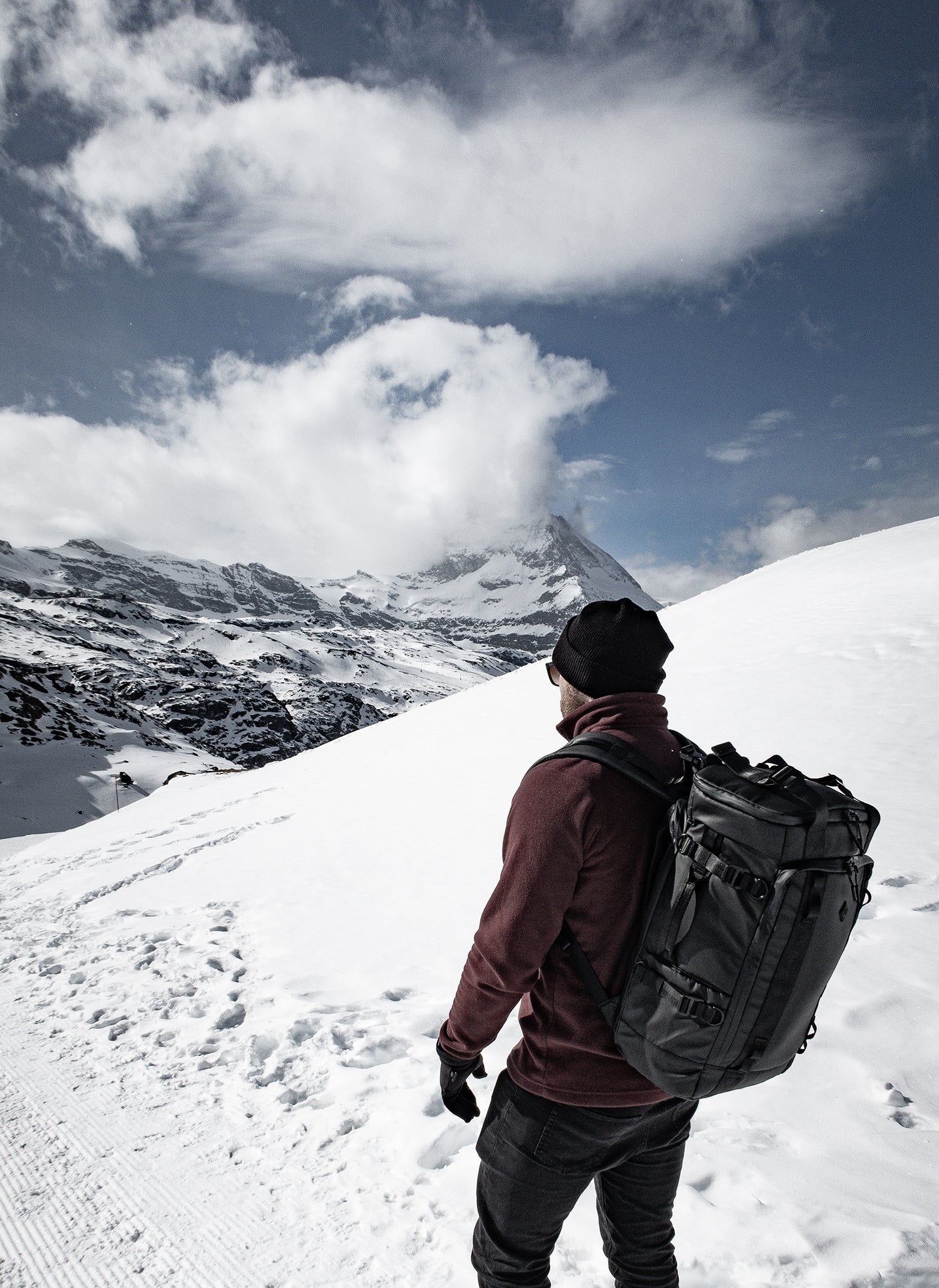 Switzerland delivers extremes. One moment, clear skies over deep valleys; the next, heavy snowfall at higher elevations. The conditions were relentless, exactly what we needed to put the Travel / Hybrid 30L, Kitbag 38L, and Sling 4L through their paces. From Interlaken to Zermatt, every mile was a test of durability, versatility, and design.